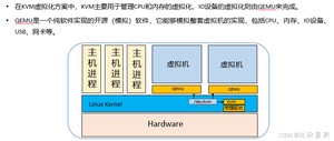 - 当运行QEMU-KVM时,KVM会加载到Linux内核中,并提供了对CPU和内存虚拟化的支持。