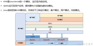 KVM本质是Linux内核中的虚拟化模块kvm.ko,KVM运行在内核空间中提供CPU和内存虚拟化,而IO设备虚拟化由运行在用户空间中的QEMU负责。