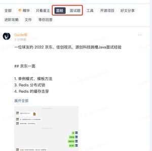 并且,知识星球还有专门分享面经和面试题的专题,里面会分享很多优质的面经和面试题。