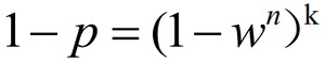 我们不得不根据特定的问题和数据集,通过实验来确定参数t和N。然而参数k(迭代次数)可以从理论结果推断。当我们在估计模型参数时,用p表示一些迭代过程中从数据集内随机选取出的点均为局内点的概率;此时,结果模型很可能有用,因此p也表征了算法产生有用结果的概率。用w表示每次从数据集中选取一个局内点的概率,如下式所示: