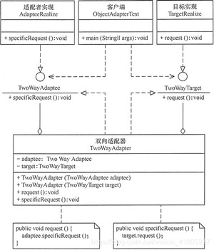 适配器模式(Adapter)可扩展为双向适配器模式,双向适配器类既可以把适配者接口转换成目标接口,也可以把目标接口转换成适配者接口,其结构图如图 4 所示。