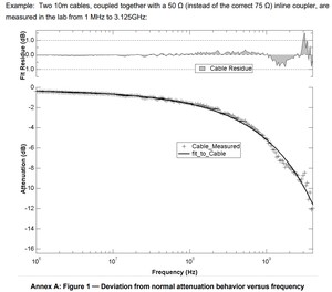 由于HOST接收端会放置均衡器,因此我们可以近似认为线缆衰减模型为理想模型,只需要在带宽内通过测量40-50个点拟合模型曲线,带宽内残差不超过1dB即可。