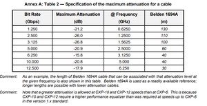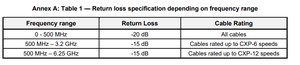 CXP要求实际的回波损耗在下列测试条件下要优于表中的值(表格中只标注了线缆最高速率的一半以内的频率,这是因为数据传输是DDR双边沿的,在时钟信号的上升沿和下降沿均携带有效数据)。