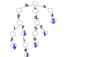 对cat,cash,app,apple,aply,ok 建一颗字典树,建成之后如下图所示