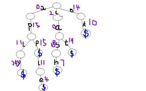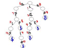 4、每个单词结束的时候用一个特殊字符表示,图中用的‘$’,那么从根节点到任意一个‘$’所经过的边的所有字母表示一个单词。