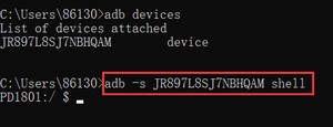 adb -s <设备号> shell:当电脑插多台手机或模拟器时,指定一个设备号进行连接