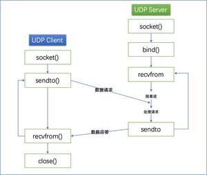 使用UDP套接字开发的网络应用Server/Client,网络IO相关操作和流程如下图所示: