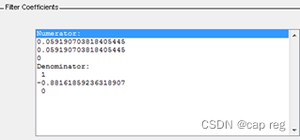 然后,点Design Filter即可,接着在菜单栏Analysis->Filter Coefficients,可以看到分母A和分子B相应的参数: