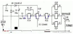 输进的正弦波电压通过由C1、C2和D1、D2组成的半波二倍压电路为IC1提供工作电源。IC1A构成放大器对输进信号进行放大,经IC1B、IC1C反相、整形变换成方波信号,再由IC1D、IC1E、IC1F进行功率放大至输出。R2用来调节输出信号幅度。