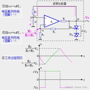 时电容反向充电,vc由零变负。在Vc高于Vp之前,不变。当Vc下降到略低于Vp时,Vo从–Vz跳变到+Vz。与此同时,Vp由