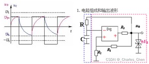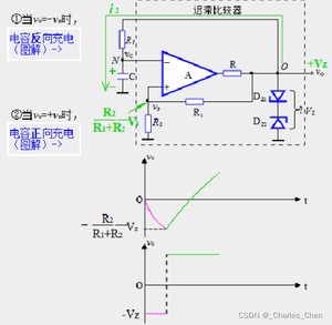 方波产生的原理是RC电路波形在滞回比较器的选择下输出方波;