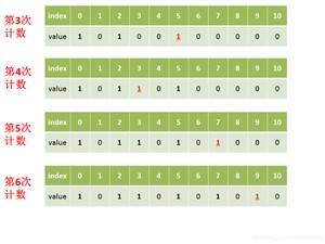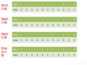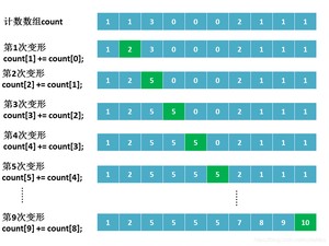 第四步操作,是让计数数组存储的元素值,等于原始数组中相应整数的最终排序位置,即计算原始数组中的每个数字在结果数组中处于的位置。