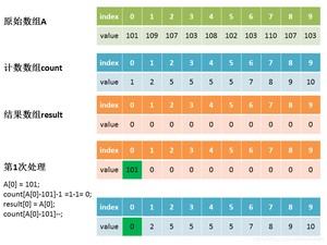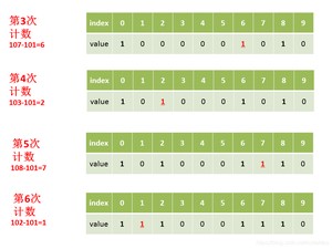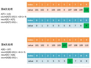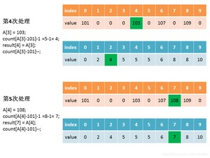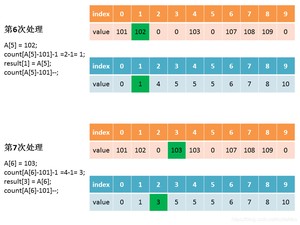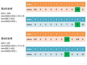 第二次遇到107()时,107-101 = 6,,即第二个107在结果数组中的索引为6,即,排序后。