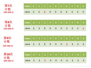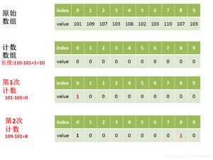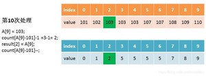 比如索引值为9的,它的元素值为10,而索引9对应的原始数组中的元素为9+101=110(要补上最小值,才能还原),即110在排序后的位置是第10位,即result[9] = 110,排完后的值需要减1,变为9。