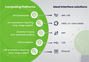 为了满足对高速连接日益增长的需求,市场上提供了各种灵活且功能强大的接口。一些在多个行业中广泛使用的最流行接口包括MIPI CSI-2、GMSL2、USB 3.0和GigE。