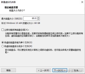 下一步>内存大小60G就够了>选择将虚拟磁盘存储为单个文件