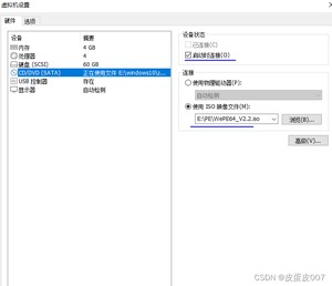 连接选择使用ISO映像文件+启动时连接打钩>选择你之前下载的WePE镜像>确定