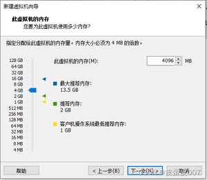下一步>虚拟机内存设置>4G(电脑是8G的选2G)