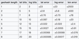 对这样的GeoHash编码大小排序后,是按照Z形曲线来填充空间的,后来又衍生出多种填充曲线且具有多种特性,由于没有Z形曲线简单通用,这里就不赘述了。下表是GeoHash的编码长度与网格大小以及距离精度的关系,对于我们第一节讨论的匹配附近2公里的车辆,使用编码长度为5就可以了,如果需要更精细的匹配,可以在GeoHash匹配的结果上进行进一步的距离筛选。