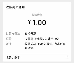 “是啊,早上起来的时候看到这条信息,还真的是挺开心的,虽然只有一块钱,但是开源的第一笔,也是我人生当中的第一笔,真的非常感谢这个读者,值得纪念的一天。”我自己也掩饰不住内心的激动。