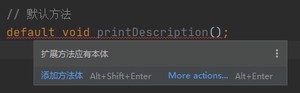 4)接口中允许定义 方法也是从 Java 8 开始的,比如说上例中的 方法,它始终由一个代码块组成,为实现该接口而不覆盖该方法的类提供默认实现。既然要提供默认实现,就要有方法体,换句话说,默认方法后面不能直接使用“;”号来结束——编译器会报错。