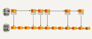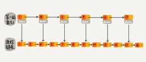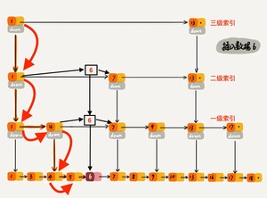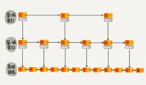 - 每个索引节点包含两个指针,一个向下,一个向右;(笔记目前看过的各种跳表源码实现包括Redis 的zset 都没有向下的指针,那怎么从二级索引跳到一级索引呢?留个悬念,看源码吧,文末有跳表实现源码)