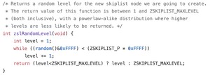 上述代码可以实现我们的功能,而且,我们的案例中晋升概率 SKIPLIST_P 设置的 1/2,即:每两个结点抽出一个结点作为上一级索引的结点。如果我们想节省空间利用率,可以适当的降低代码中的 SKIPLIST_P,从而减少索引元素个数,Redis 的 zset 中 SKIPLIST_P 设定的 0.25。下图所示,是Redis t_zset.c 中 zslRandomLevel 函数的实现: