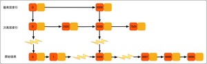 如下图所示,假如一直往原始列表中添加数据,但是不更新索引,就可能出现两个索引节点之间数据非常多的情况,极端情况,跳表退化为单链表,从而使得查找效率从 O(logn) 退化为 O(n)。那这种问题该怎么解决呢?我们需要在插入数据的时候,索引节点也需要相应的增加、或者重建索引,来避免查找效率的退化。那我们该如何去维护这个索引呢?