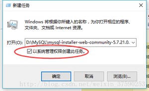4. 手动输入所下载的MySQL安装文件的地址+文件名。比如我放在D:MySQL文件夹里,文件名为:mysql-installer-web-community-5.7.21.0.msi,就输入:D:MySQLmysql-installer-web-community-5.7.21.0.msi,务必要打上 下面的勾。