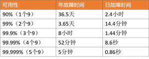 高可用性是指系统具有较高的无故障运行能力,可用性 = 正常运行时间 / 系统总运行时间,一般使用几个9来描述系统的可用性。