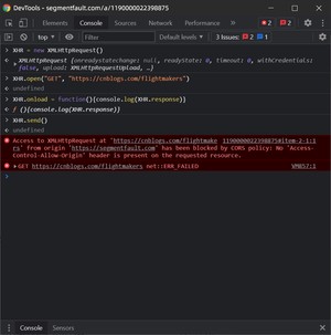 如果我在Segmentfault官网的Console访问我的博客园首页, 就会触发XHR跨域限制, 禁止读取返回内容.