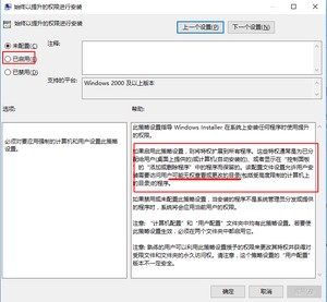 本地组策略编辑器——>用户配置——>管理模板——Windows组件——>Windows Installer——>始终以提升的权限进行安装——选择已启用,并点击应用