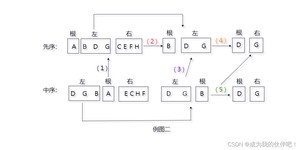 详细解释:由先序遍历推出根结点为A,由(1)可推左子树为DGB,右子树为ECHF;由(2)可确定左子树的根为B;根为B,由(3)可推知DG为左子树,再由(4)知D为根,由(5)可推G为右子树;这样就可以画出左边的图了(例图三)。ECHF交给你们了,请用好我的“三分法”哦!结果为(例图四);由先序推根,中序推左右子树。