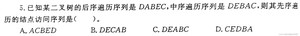 解释:后序可判断C为根结点,这样从(1)可推出左子树,大家可还记得上面图四和图二的后序遍历吗?看看他们各自的根结点与总结点A有上面关系?你试着画一个没有右子树的,看看它的后序遍历是什么。这样由后序(2)可推E为根,由中序可推左右子树,(5)再推根,又可中序推出左右子树,这样图5.2就画出来了。中序判左右,后序判根结点。再看下一题巩固下。
