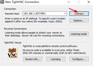 接着在电脑上打开TightVNCViewer软件,输入树莓派的IP地址和端口后点击connect。端口不是5901的话可以用netstat -lntp命令查看一下树莓派监听的端口。
