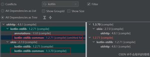 将okhttp升级到4.8.1版本后,还是不行,这时候就要思考是不是okhttp的版本冲突导致,可以通过下载Maven help插件看依赖树,我们可以注意到了报错信息中的NoSuchMethodError: kotlin.collections.ArraysKt.copyInto通过搜索kotlin