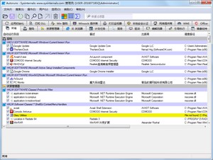 Autoruns是一款由微软旗下Sysinternals公司出品的专业系统启动项管理工具,这款工具小巧免费,单执行文件,利用它可以查看管理包含系统和任何软件的自动启动项位置的所有信息。它即能显示 Windows 启动或登录时自动运行的程序,又允许用户自定义禁用或删除它们,例如,那些在“启动”文件夹和注册表相关键值中的程序。此外它还可以管理包括:资源管理器右键扩展(如右键菜单项目)、IE浏览器插件(如工具栏扩展)、系统服务和驱动、计划任务、镜像劫持等自启动程序类目的所有详细,进行验证分析操作。
