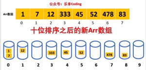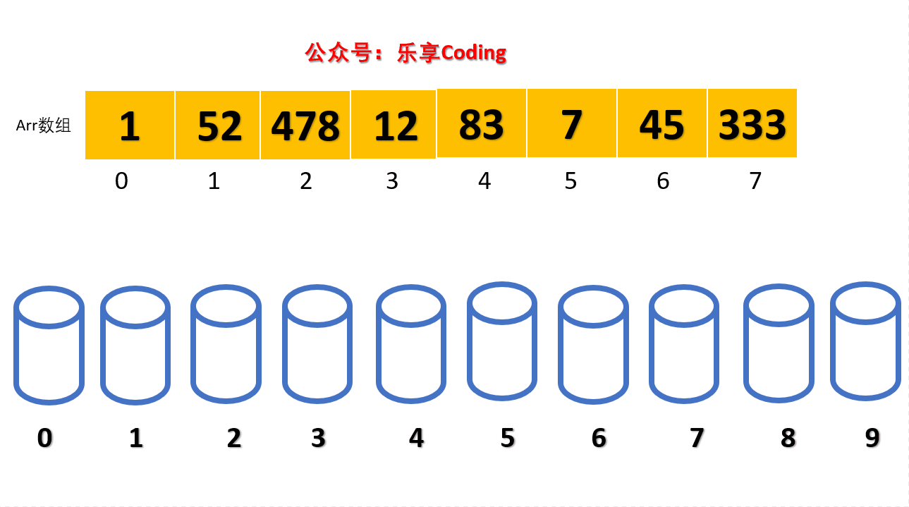根据动图可以看到桶应该是个,既要有编号(0-9),又要存数据(0-arr.length)。