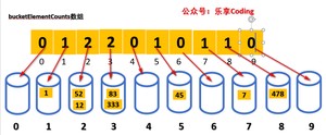 除了桶这个需要额外空间之外,我们还需要一个数组来记录每个桶中的元素个数,目的是方便最后取出。