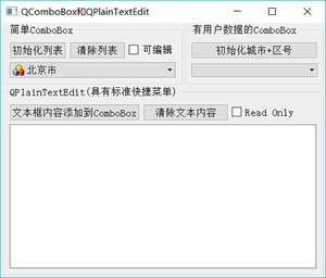 例samp4_6演示QComboBox和QPlainTextEdit(后者以后会讲)的使用,运行时界面如下图所示: