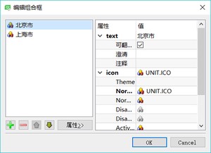 QComboBox的主要功能是提供一个下拉列表供选择输入。在界面上放置一个QComboBox组件后,双击此组件,可以出现如下图所示对话框,对QComboBox组件的下拉列表项进行编辑。在下图所示的对话框中,可以进行如添加、删除、上移、下移操作,还可以设置Item的图标: