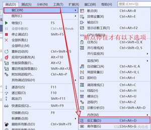 在正向开发的过程中,可以在编译器Visual studio里,查看C++代码的汇编代码,在程序中设置断点,F5编译,等程序停住后,才有查看汇编选项:
