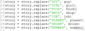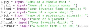 其中,“ ”是转义字符,表示换行,“+”后面的“”用于多行显示字符串。字符串中的大写字母如“GUY”、“GIRL”、“PLANET”以及“NUMBER”等,是故事框架中的“占位符”,之后会将其替换为用户输入的信息。