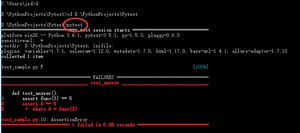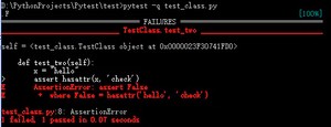 从测试结果中可以看到,该测试共执行了两个测试样例,一个失败一个成功。同样,我们也看到失败样例的详细信息,和执行过程中的中间结果。-q即-quiet,作用是减少冗长,具体就是不再展示pytest的版本信息。