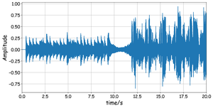 python可以用librosa库来读取音频文件,但是对于MP3文件,它会自动调用audio_read函数,所以如果是MP3文件,务必保证将ffmpeg.exe的路径添加到系统环境变量中,不然audio_read函数会出错。这里我们首先读取音频文件,并作出0-20秒的波形。现在的音乐文件采样率通常是44.1kHz。用y和sr分别表示信号和采样率。代码和图形如下: