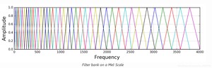 最后一步是将梅尔滤波器运用到上一步得到的pow_frames上。所谓梅尔滤波器组是一个等高的三角滤波器组,每个滤波器的起始点在上一个滤波器的中点处。其对应的频率在梅尔尺度上是线性的,因此称之为梅尔滤波器组。每个滤波器对应的频率可以将最大频率(下图中是4000,我们这里是22.05k)用上文中提到的公式转换成梅尔频率,在梅尔尺度上线性分成若干个频段,再转换回实际频率尺度即可。实际操作时,将每个滤波器分别和功率谱pow_frames进行点乘,获得的结果即为该频带上的能量(energy)。这里我们的pow_frames是一个(1999,513)的矩阵(这里可能有人疑问513咋来的?我们刚刚做的不是1024点FFT吗?这里注意因为我们用了rfft,只用了非负的那一半频率,所以是1024/2+1个点),梅尔滤波器fbank是一个(mel_N, 513)的矩阵,其中mel_N代表对应的梅尔滤波器个数,这个值不能太大,因为这里我们一共只有513个点,如果mel_N取得太大,会导致前面几个滤波器的长度都是0 (因为低频的梅尔滤波器特别窄)。我们只要将这两个矩阵相乘pow_frames*fbank.T即可得到mel-spectrogram,结果是一个(1999, 40)的矩阵,每一行是一帧,每一列代表对应的梅尔频带的能量。具体梅尔滤波器的图例和计算公式以及对应代码如下: