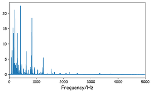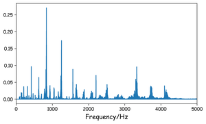 这两段代码里用了函数librosa.fft.rfft(y,n),rfft表示经过fft变换之后只取其中一半(因为另一半对应负频率,没有用处), y对应信号,n对应要做多少点的FFT。我们这里的信号有44.1k*20=个点,所以对应的FFT 也做点的FFT,每一个点所对应的实际频率是该点的索引值*fs/n,这是咋得出来的?因为第个点应该对应(约等于)fs(或者离散域中的2pi),所以前面的点根据线性关系一一对应即可。这里只展示0-5000Hz,可以看出,经过预加重之后的信号高频分量明显和低频分量的差距没那么大了。