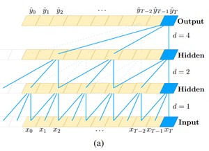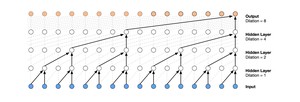 纯净的因果卷积仍然存在传统卷积神经网络的问题,即建模时间的长短受到卷积核大小的限制。 如果想获得更长的依赖关系,需要线性的堆叠许多层。 为了解决这个问题,研究人员提出了膨胀卷积,如下图所示。
