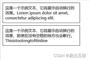 上述代码创建了两个容器,其中包含相同长度的示例文本。第一个容器将展示默认的换行行为,而第二个容器应用了 类,将展示自动换行效果,即使文本中没有空格。