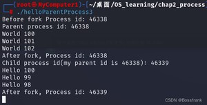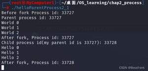 可以明显的看到父子进程同时存在,第二行是子进程32728,其父进程号PPID是33727。从父子进程的执行过程我们看到,貌似是先执行了父进程输出三个world,然后才执行了子进程输出三个hello,然而事实真的是这样吗?父子进程应该是并发执行的,也就是说if语句的两个分支应当是并发执行,在这个例子中我们好像没有看到并发的特点,下段代码将改进。